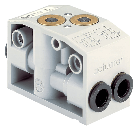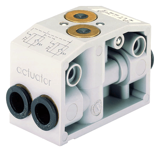 Two check valves are integrated in Type 0498. If this double pilot controlled check valve is combined with two 3/2-way valves, a 5/3-way function with all parts blocked (circuit function L) can then be released.