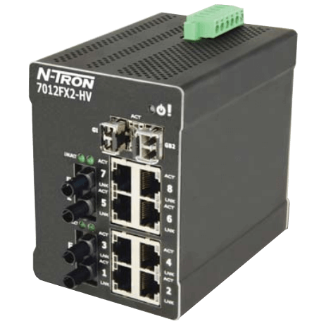 The rugged N-Tron 7012FX2-HV compact, fully managed industrial Ethernet switch offers a powerful combination of eight 10/100BaseTX copper ports, two 100Base fiber ports and two SFP gigabit ports, as well as a hardened metal enclosure for maximum durability.